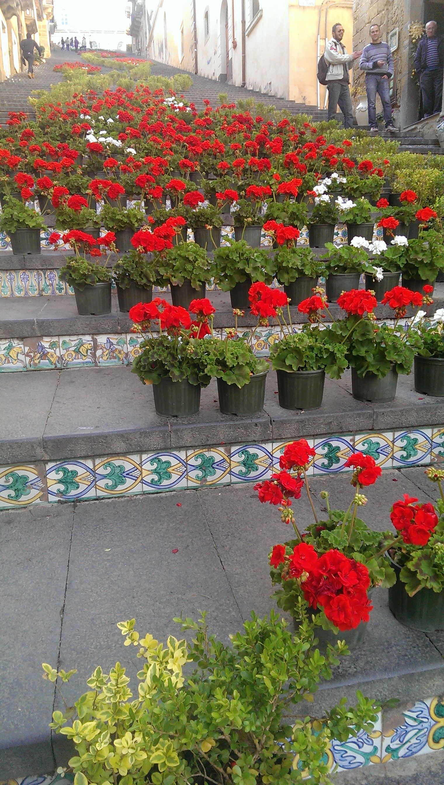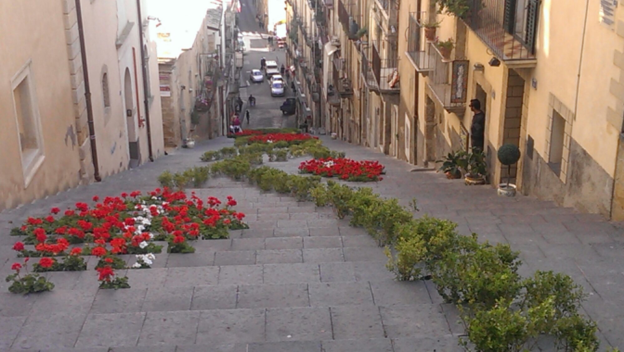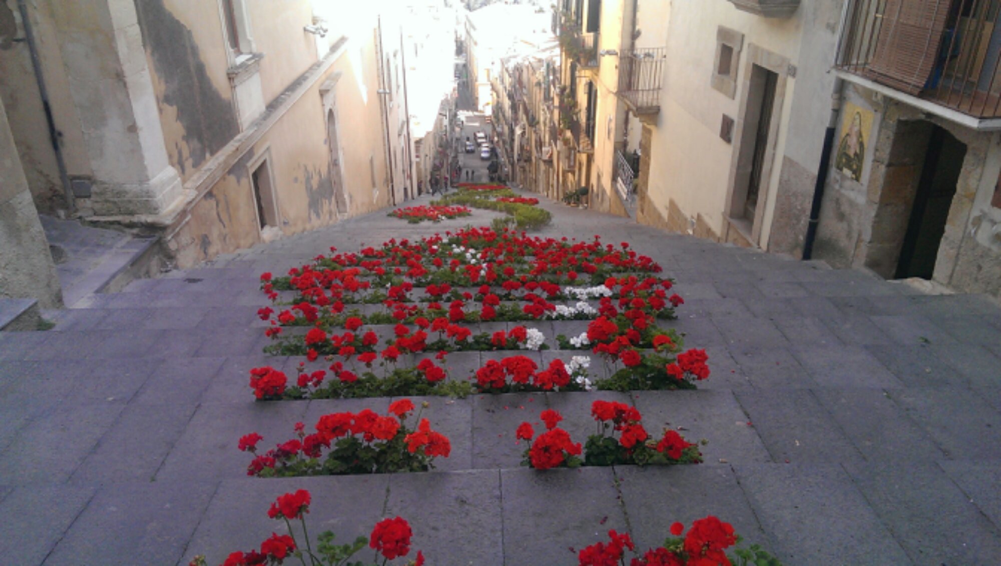 Infiorata lungo la famosa Scalinata in ceramica decorata di Santa Maria del Monte a Caltagirone, in onore della Madonna di Conadomini, ogni anno gran parte dei 142 scalini viene decorato con circa 2.000 piante creando un disegno a tema.