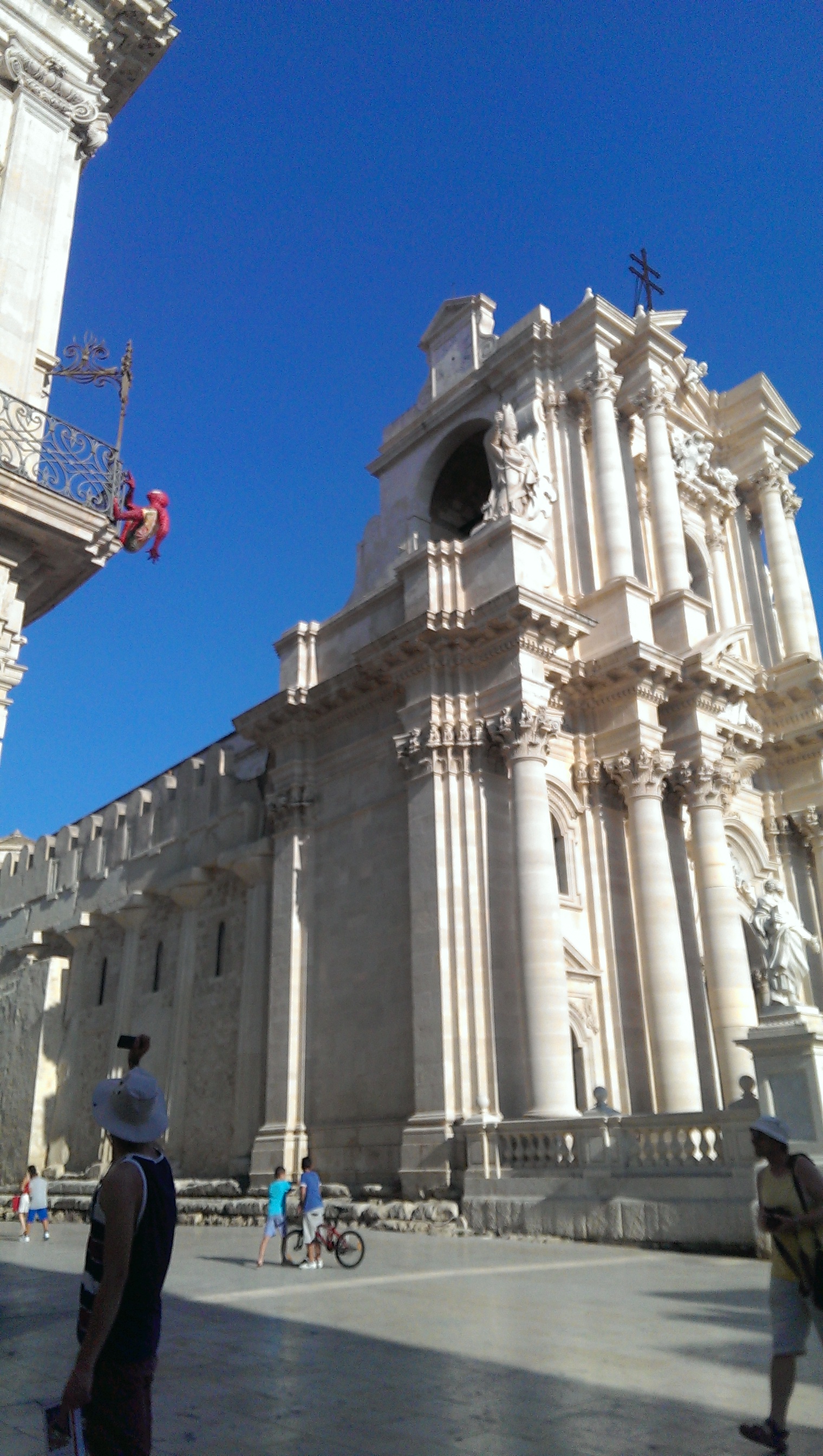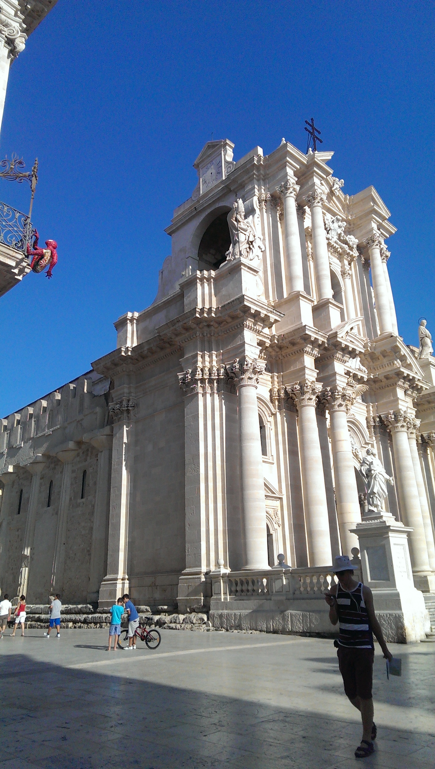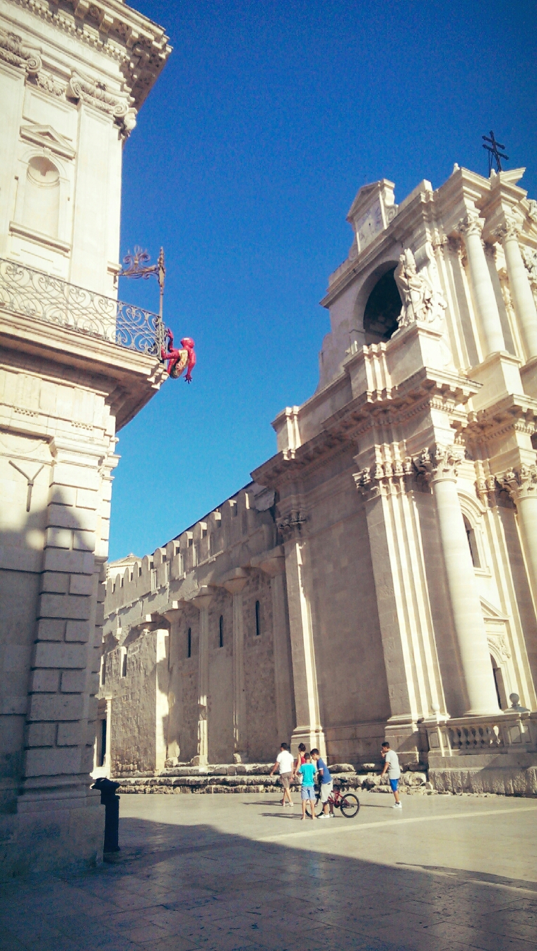 Spyderman climbing adventure in Syracuse Ortigia old, little island, at white Greek Duomo big square.
