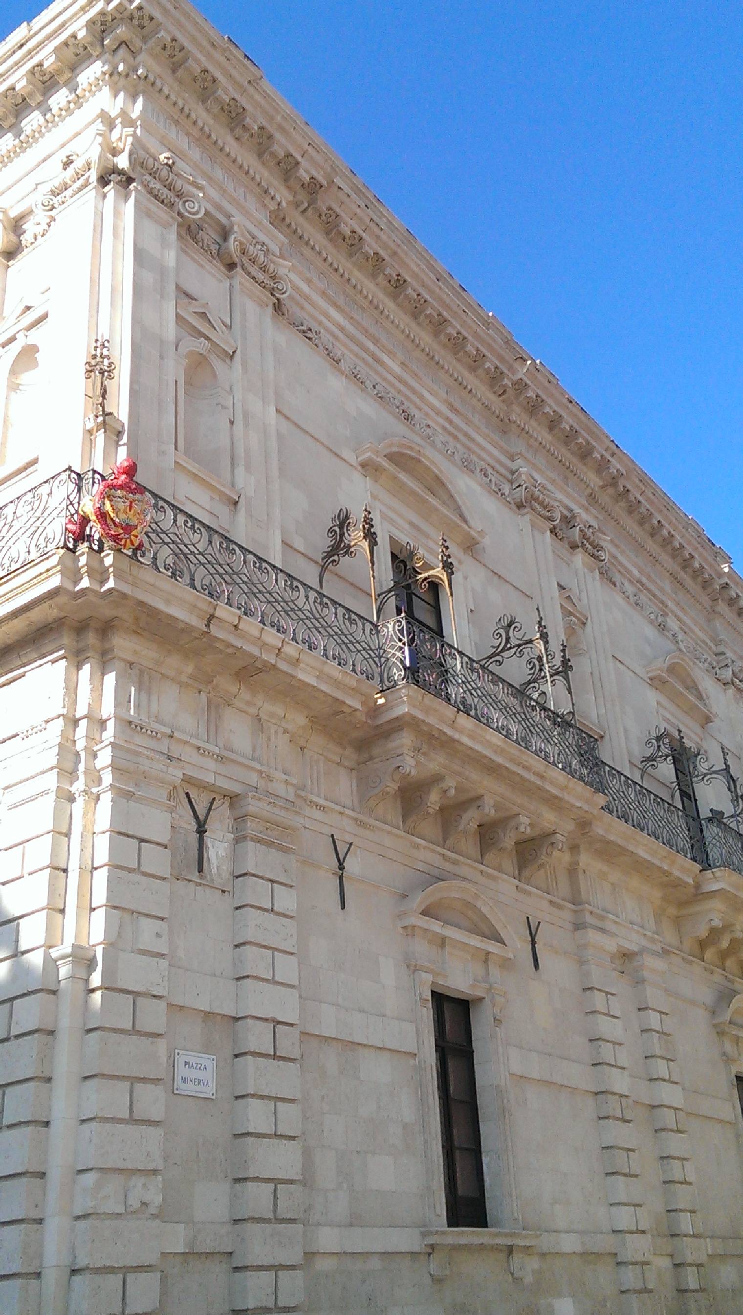 L’Uomo Ragno in arrampicata nella bellissima greca e bianca piazza Duomo di Siracusa, nella antica piccola isola di Ortigia.