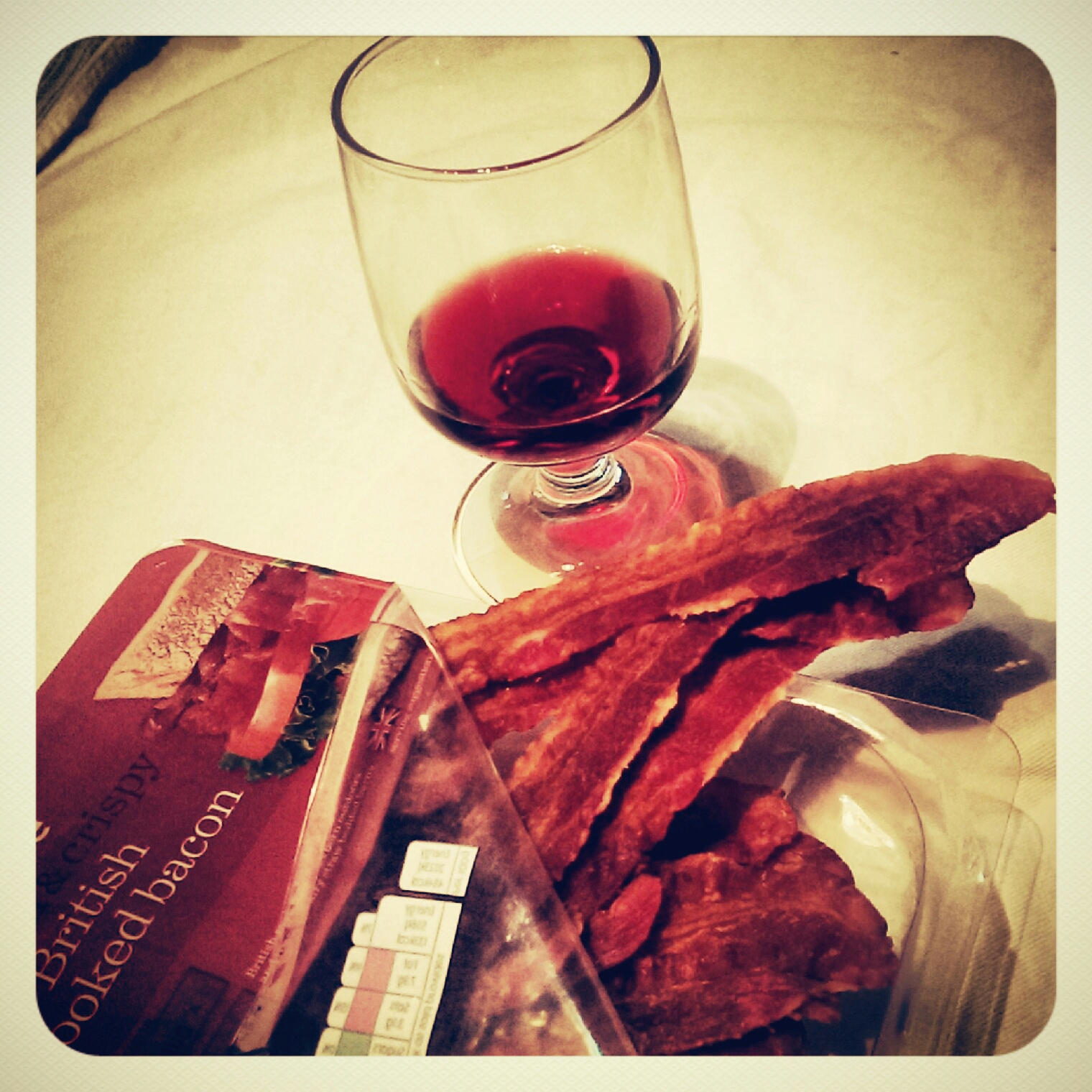 Eating thin & crispy British cooked fantastic bacon that I really love, directly arrived to my table from London UK, having it in combination with the mineral tasty and alcoholic flavour of a real pure Nerello Mascalese red strong great wine by Etna mount and volcano, UNESCO heritage.