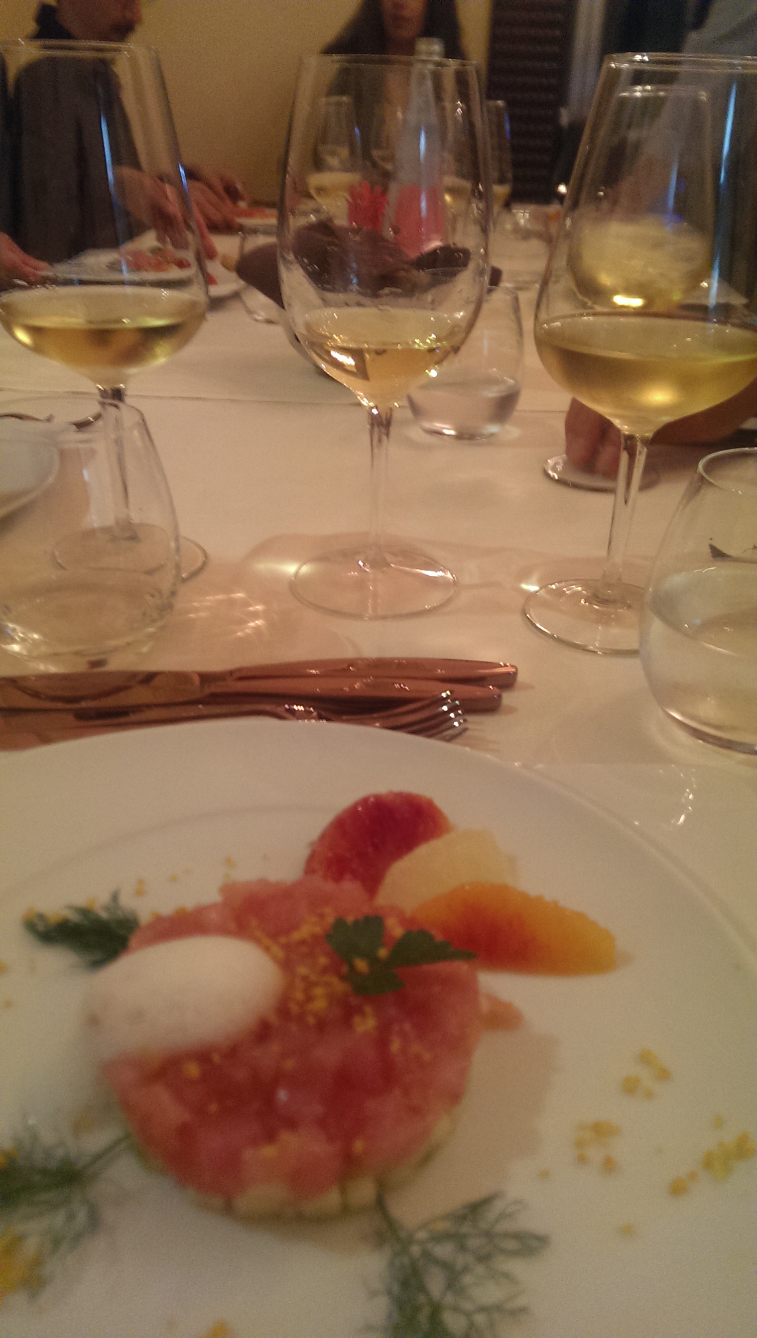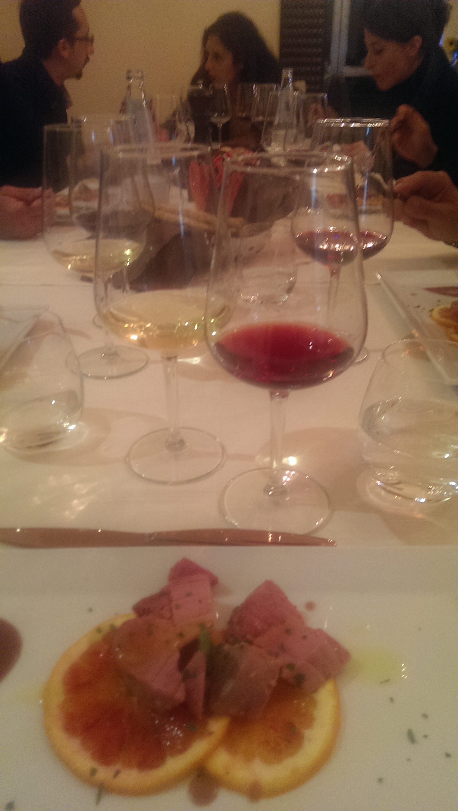 Wine dinner tasting bianco 2010 oro nel colore e al palato, caratteristiche che splendidamente mantiene a lungo durante il pasto, ottimo anche da aperitivo, e poi il rosso A Culonna serio fresco di beva più lo guardi, lo bevi e più ti da soddisfazioni al palato, queste ultime con la forza di cambiare e compiacerti con caratteristiche in evoluzione man mano che passa il tempo (ore), tutto ciò abbinato a ricercate ma tradizionali ricette di pesce super fresco del Mediterraneo preparate e abbinate dal sapiente Paolo Trimarchi ristoratore, innovatore impavido che si diletta insieme allo chef e staff a creare “insiemi” di gusto che come opere d’arte ti giungono al tavolo, opere d’arte per le quali la didascalia la fai tu mentre ammiri e gusti il tutto.