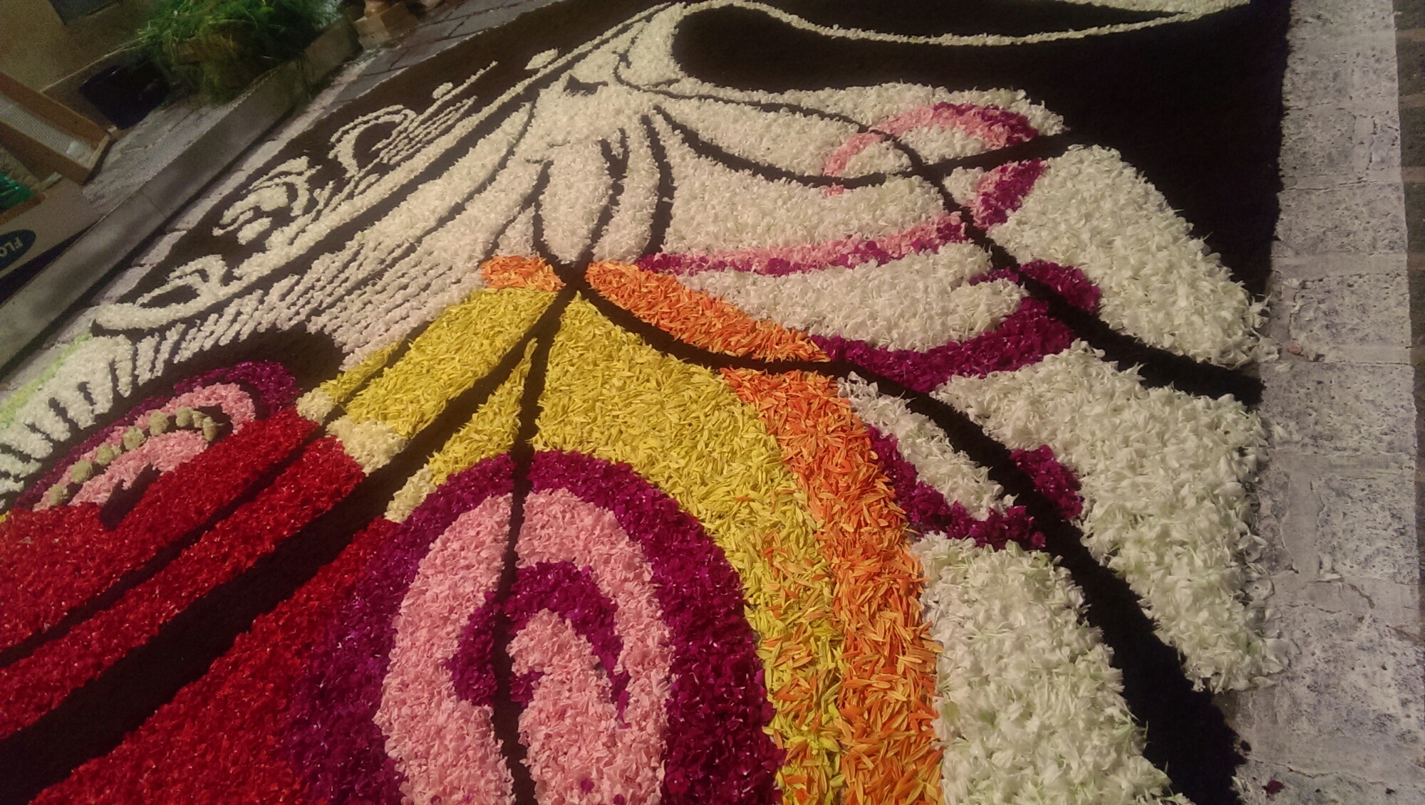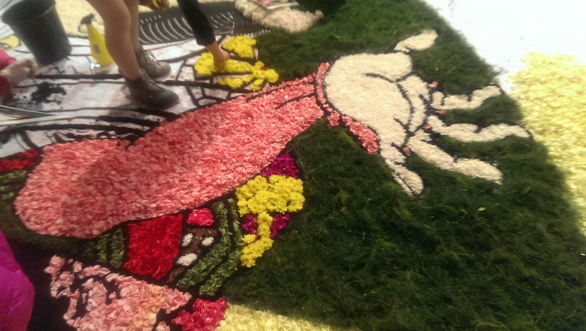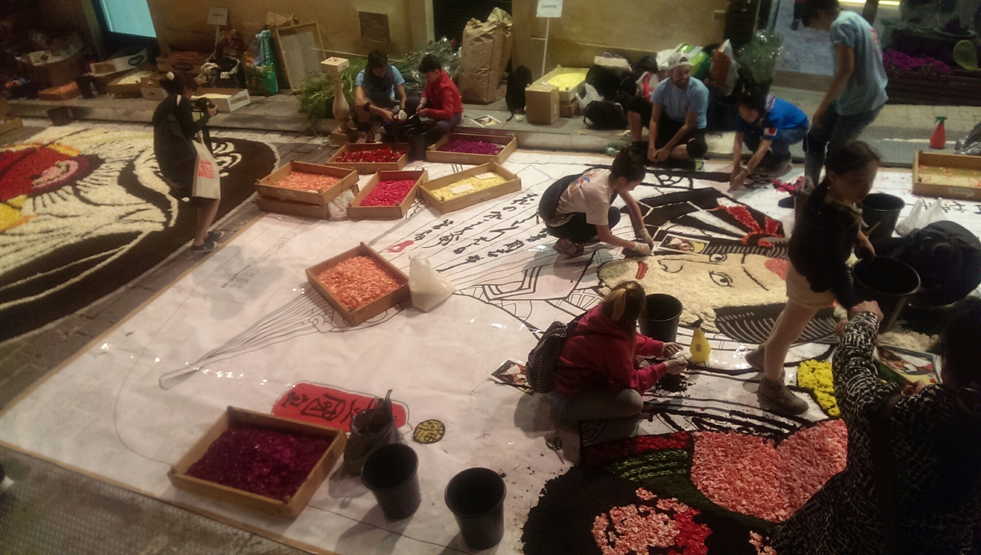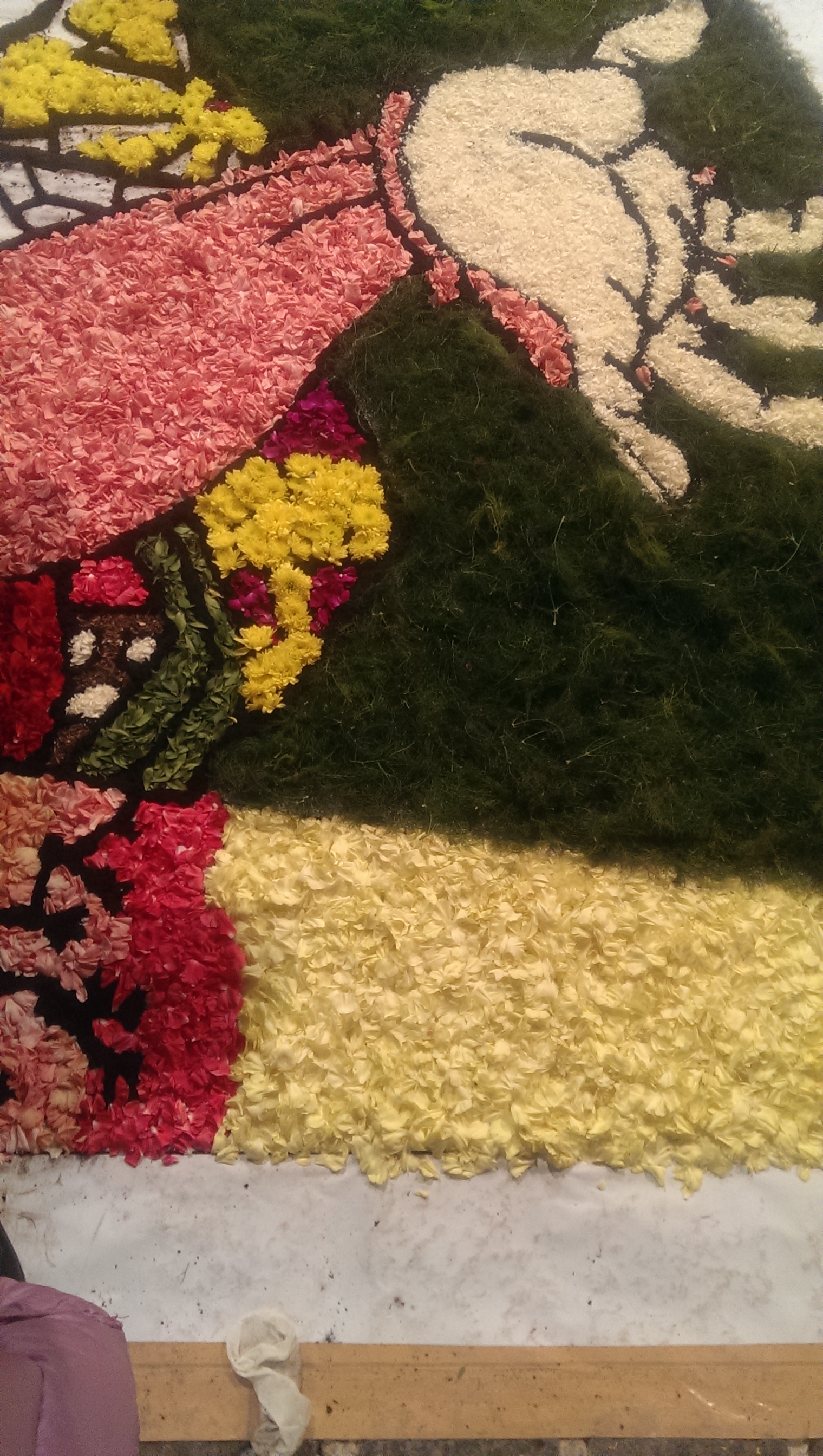 Let’s discover such a stunning flowering art masterpiece they create for current edition, artists fom several lands of the world, they are at work to decorate the drawings on the floor with petals flower.