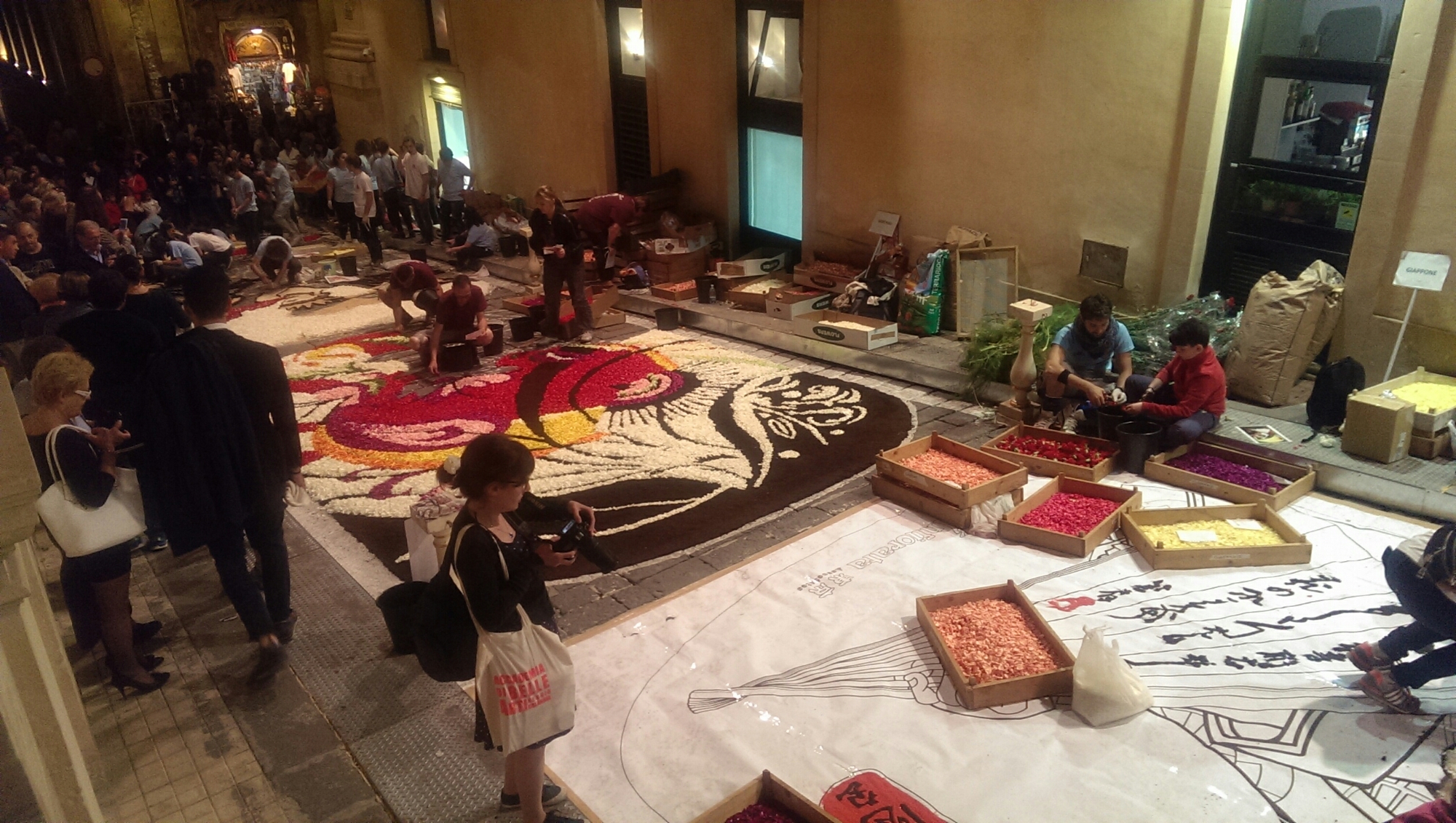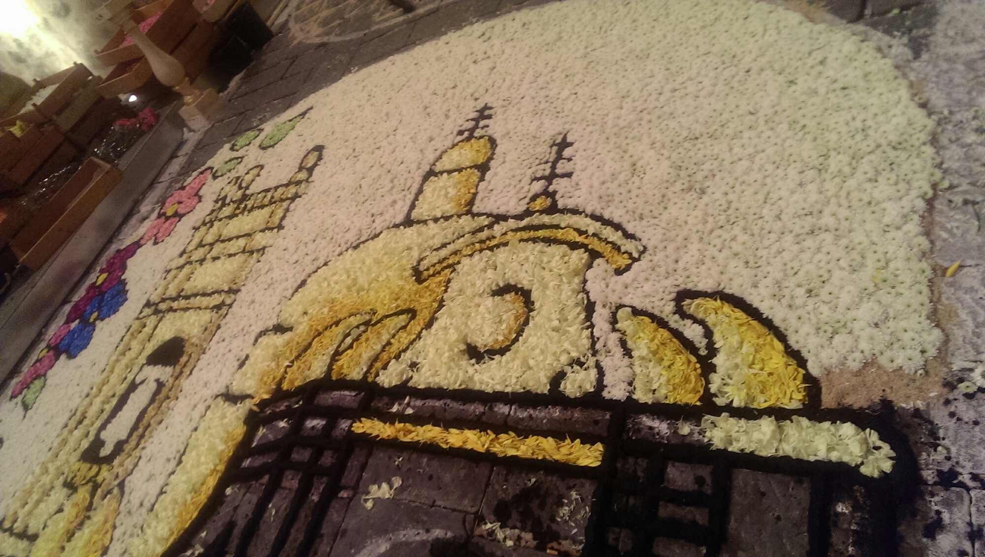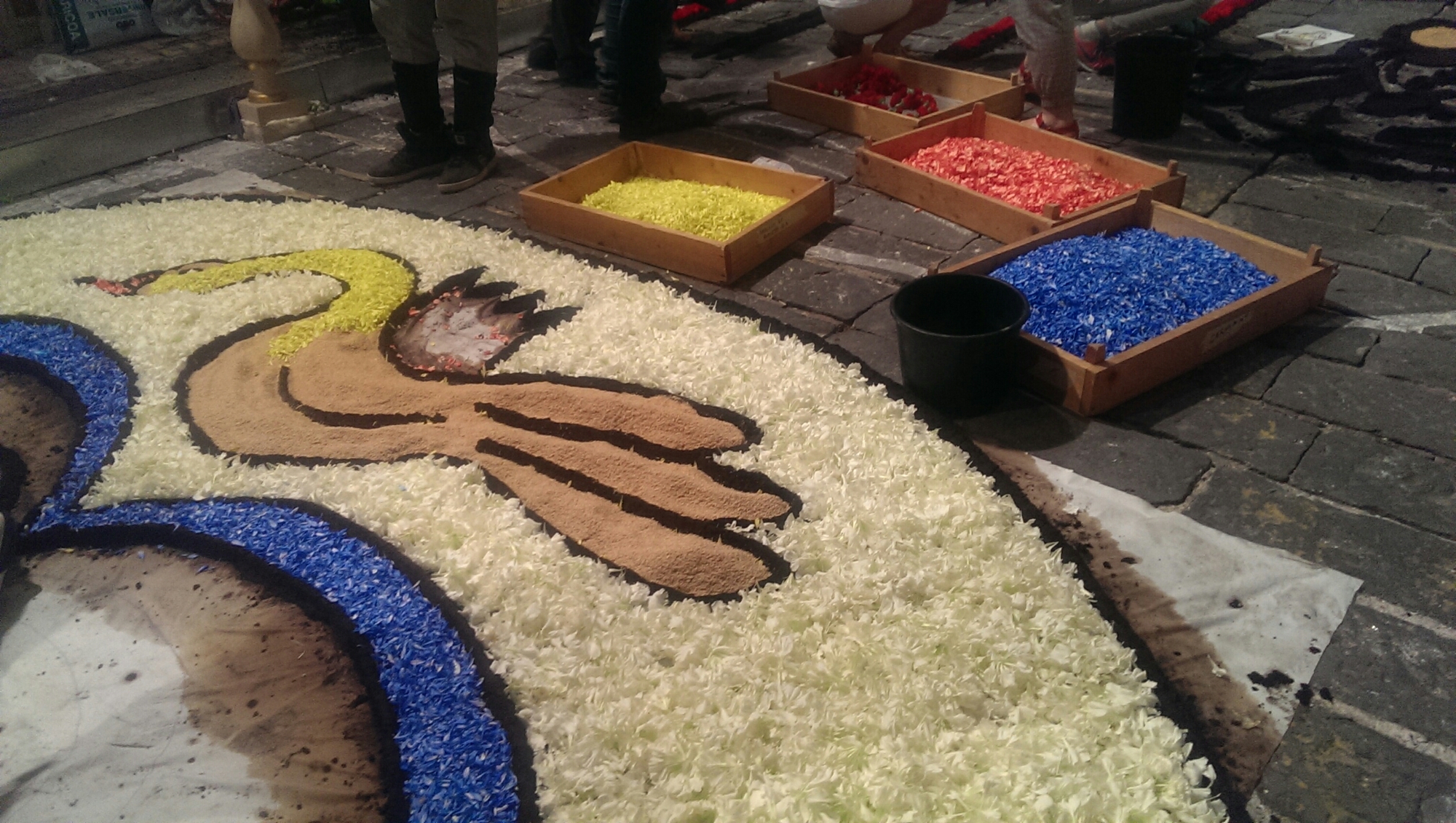 Let’s discover such a stunning flowering art masterpiece they create for current edition, artists fom several lands of the world, they are at work to decorate the drawings on the floor with petals flower.