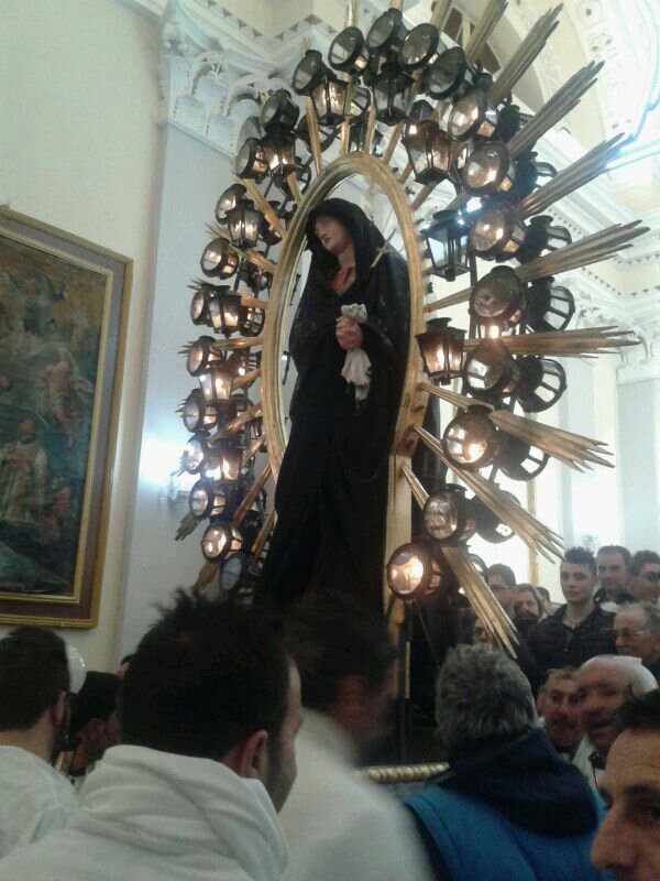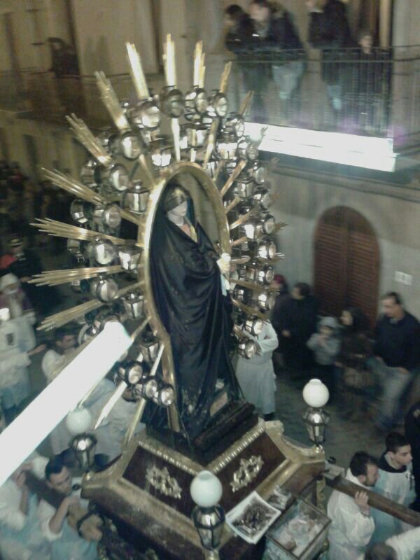 Jesus Christ on his cross and the mother suffering Madonna, people in faith are bringing them both on their shoulders in a long and hard procession. Religion is the input.