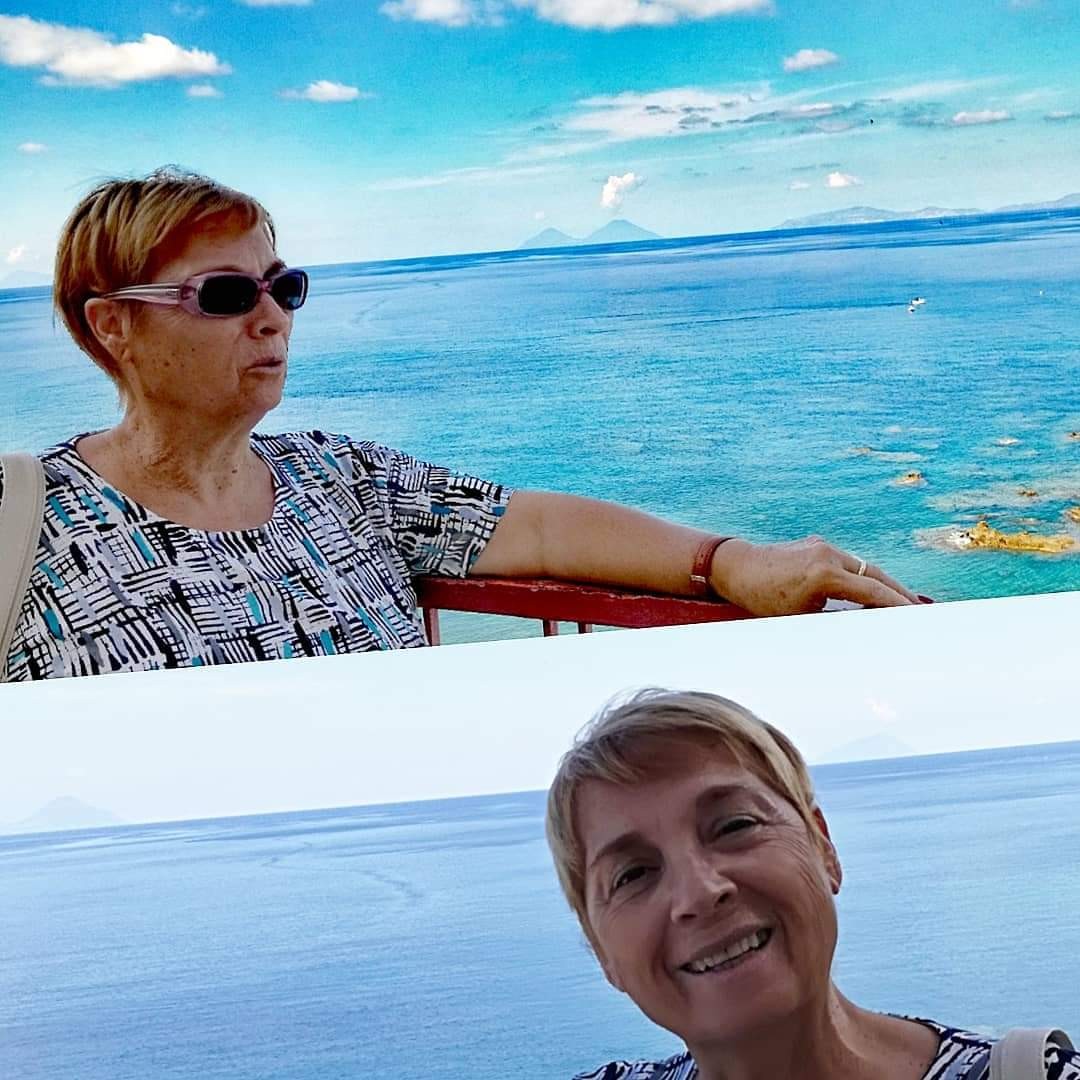 La signora in foto, (mia zia peraltro) dopo essere stata a farsi bella in parrucchieria, è pronta per le vacanze, alle spalle le Isole Eolie!